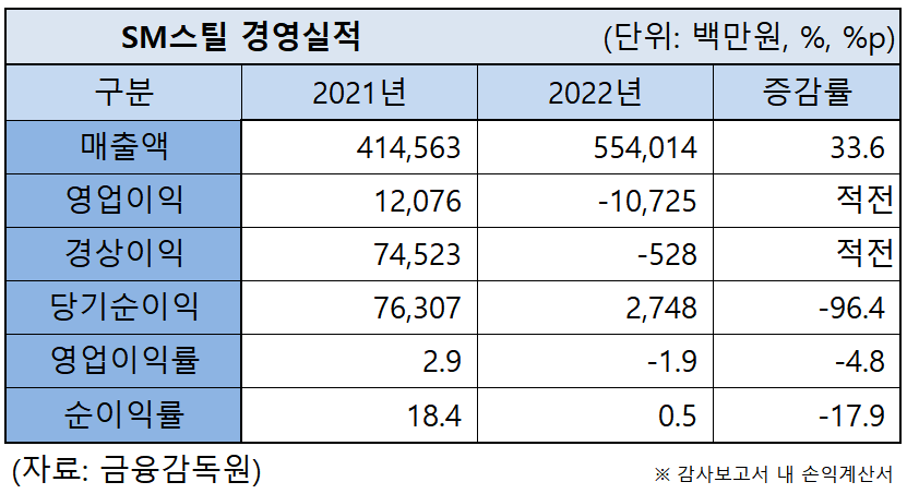 다만 지난해 철강 및 스테인리스 시황 악화, 원소재 공급 등 이슈 발생으로 수익성은 악화됐다. SM스틸의 지난해 영업이익은 107억2,500만원 적자를, 당기순이익은 전년 대비 96.4% 감소한 27억4,800만원을 기록했다. 이와 관련해 판관비용 부문에서 대손상각비와 수출제비용, 복리후생비, 운반비 등이 전년에 비해 큰 폭으로 증가했다.