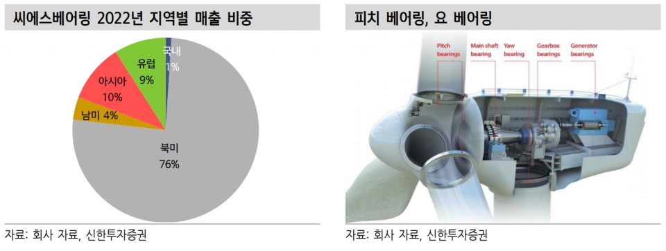신한투자증권 기업분석부 명지운 책임연구원과 이동헌 부부장연구위원은 인플레이션감축법(IRA)의 간접적이지만 빠른 수혜와 터빈 대형화에 따른 제품평균판매가(ASP) 상승이 기대된다며 씨에스베어링을 주목했다.