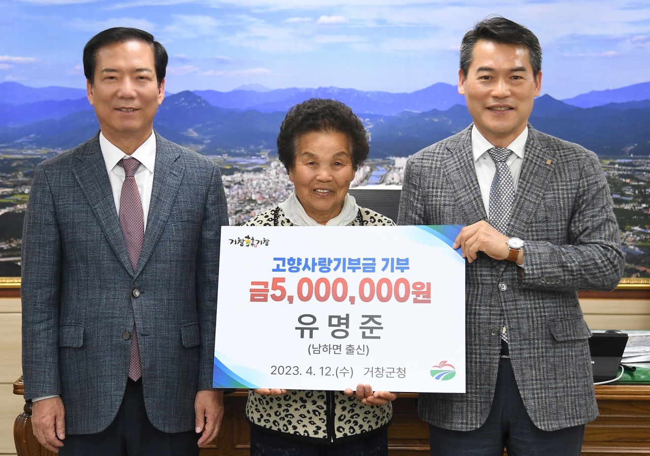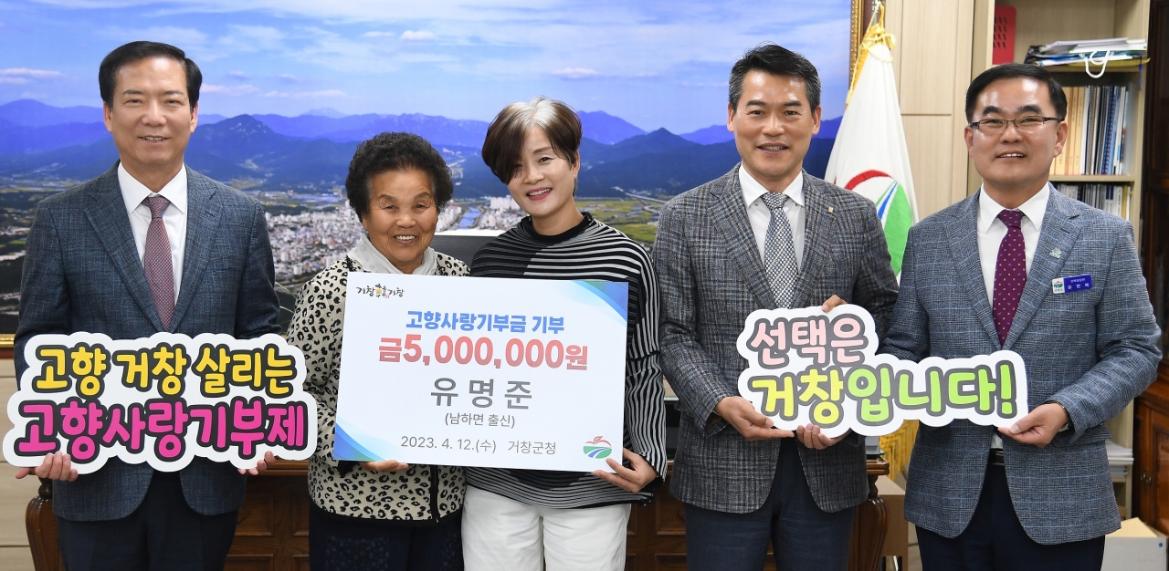 지난 12일, 유명준 대표는 모친 추옥순 여사와 함께, 거창군청을 방문해 500만원을 기탁했다. 이는 거창군이 추진하고 있는 고향사랑기부제의 현재 최고 기부금액이다. 유명준 대표는 거창군이 답례품으로 제공하는 150만원 상당의 지역상품권도 자신의 고향인 남하면에 기부했다.