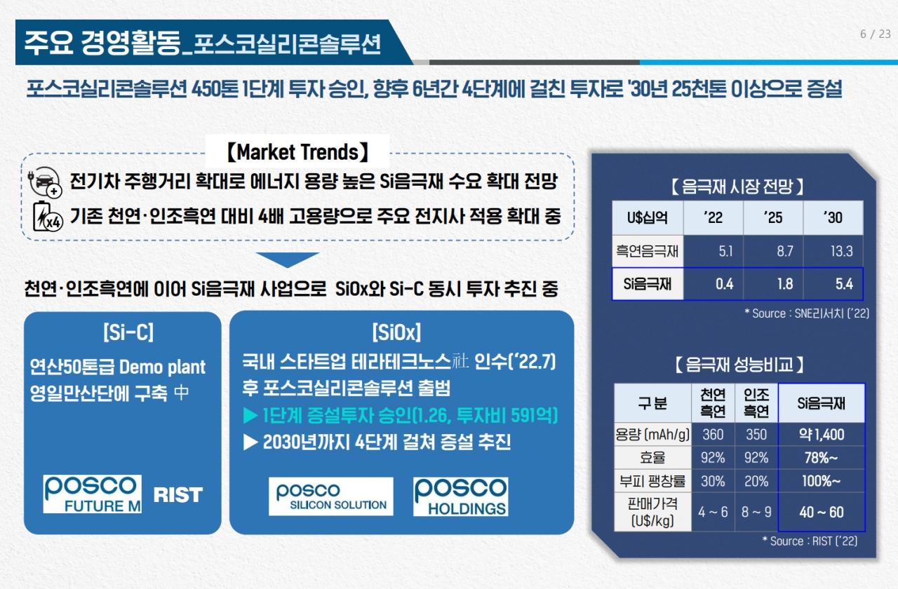 포스코는 천연·인조흑연에 이어 Si음극재 사업으로 SiOx와 Si-C 동시 투자를 진행한다고 발표했다. Si-C 사업을 위해 연산 50톤급 데모 공장이 영일만산단 구축될 예정이며 SiOx 사업 진행은 지난해 7월 포스코실리콘솔루션이 출범하면서 본격화되기 시작했다.