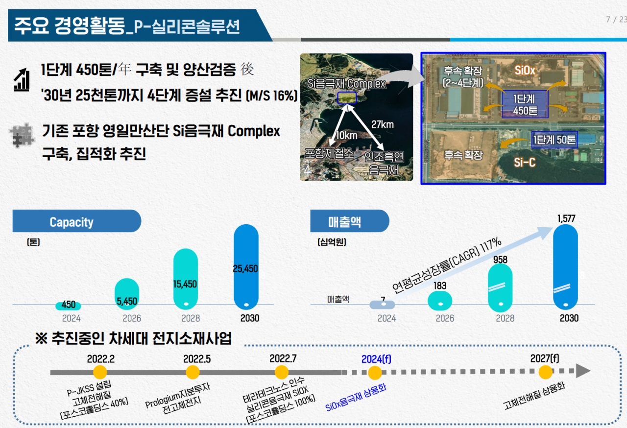 포스코실리콘솔루션은 올해 1월 450톤 증설에 대한 1단계 증설투자를 승인 받아 591억원이 투입된 것으로 전해졌다. 2030년까지 향후 6년동안 4단계에 걸쳐 증설이 추진될 예정이다. 사업이 성공적으로 진행될시 SI음극재는 2,500톤 규모로 증설되며 이에 따른 매출액은 1조5,770억 원에 달할 것으로 예상된다.