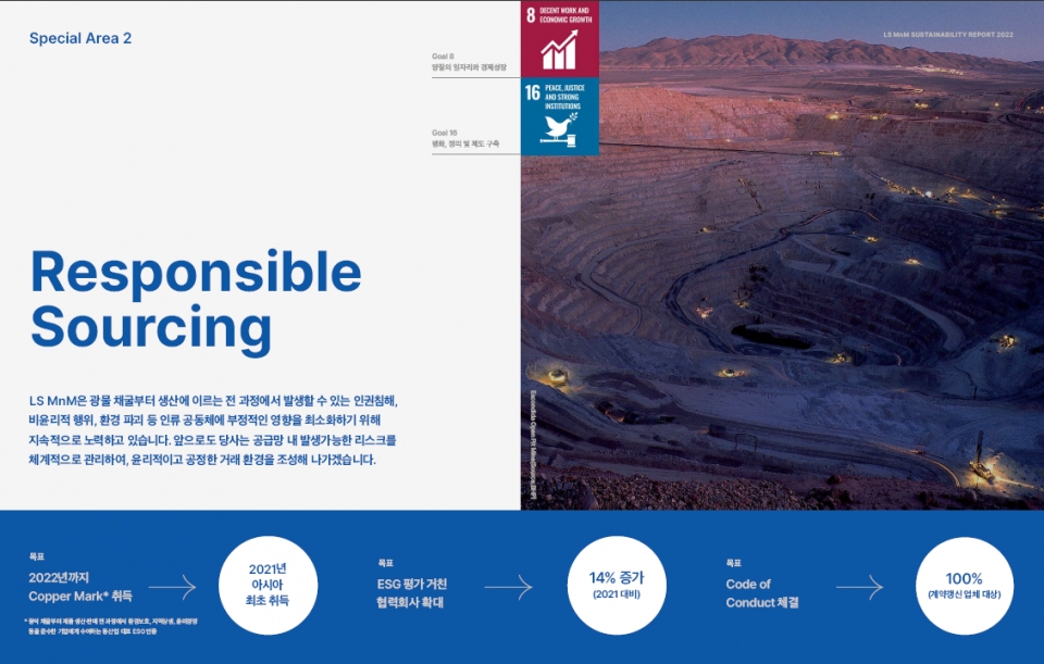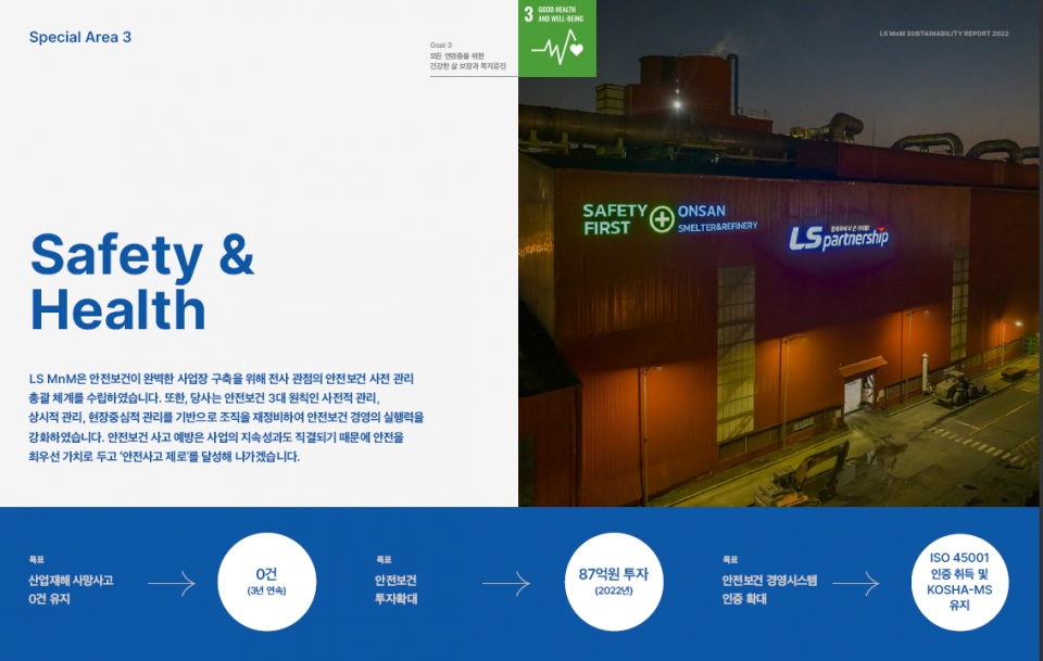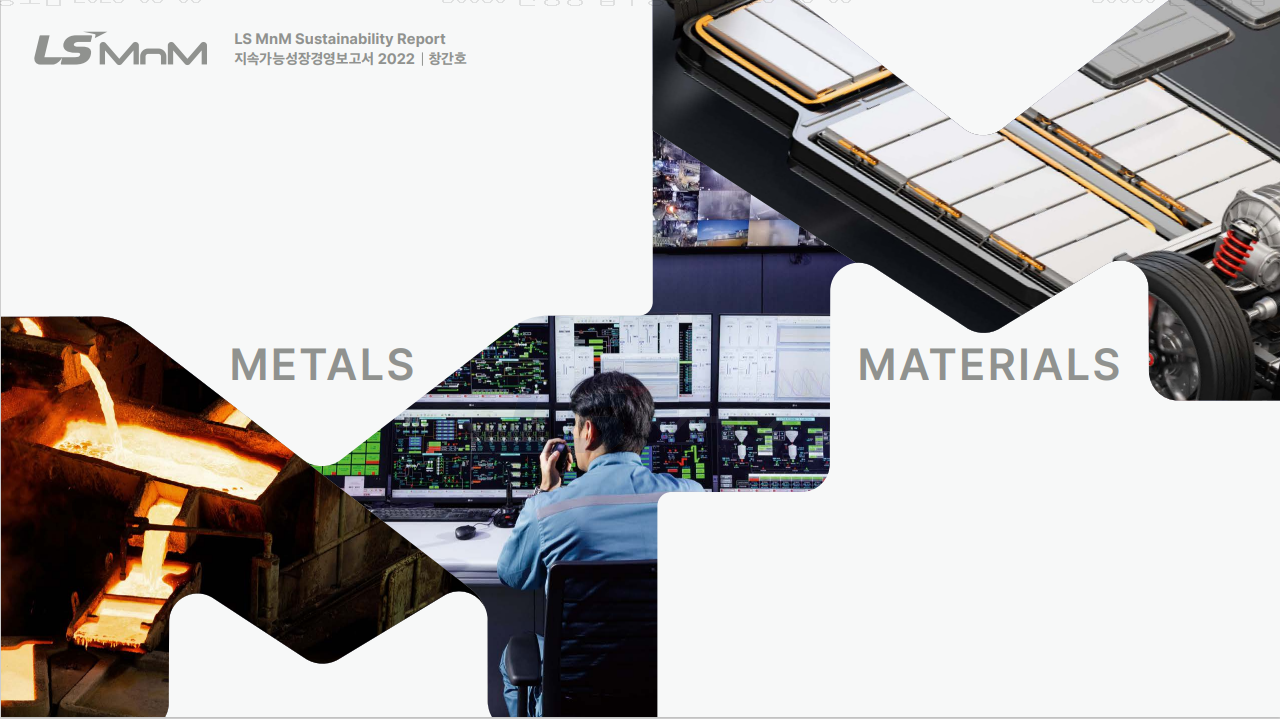 한편 국내 유일의 동제련소를 운영하는 회사는 2022년 사명을 바꾼 바 있다. 새로운 사명 LS MnM은 동제련소를 중심으로 한 기존의 금속산업(Metals)에, 미래 성장산업 내 소재분야(Materials)에서 회사의 가치를 추가로 창출하겠다는 의지를 담고 있다. LS MnM 지속가능성장경영보고서는 회사 홈페이지(http://www.lsmnm.com/board/postList/esg)에서 볼 수 있다.