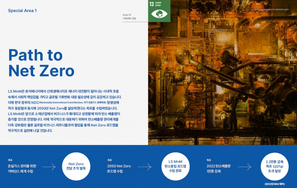 보고서 내용 중 특별히 의미 있는 성과로는 ‘지구’ 코너의 ‘2050탄소중립을 위한 넷제로 로드맵 수립’, ‘디지털 기술 적용을 통한 환경 보호’가 눈에 띈다.