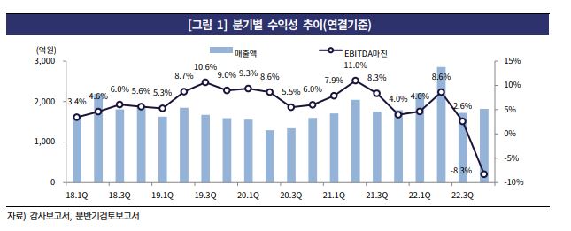 또한 외형성장에 따른 매출채권 등의 운전 자본 투자 증가와 신규 설비 도입으로 자본적 지출(CAPEX)이 확대로 잉여현금흐름(FCF) 적자가 지속됐다며 건설 부문의 대위변제로 순차입금은 1495억원으로 크게 증가했다고 부연했다.