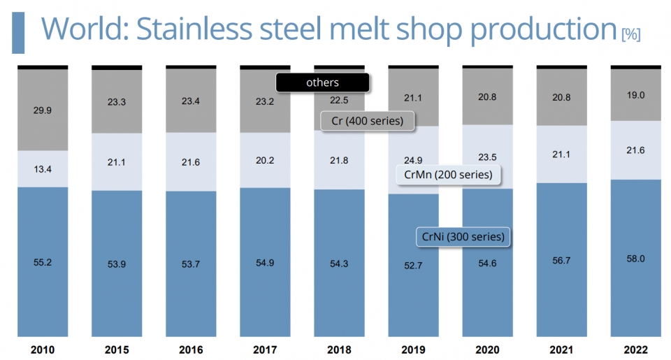 한편 세계스테인리스협회는 지난해 전 세계 스테인리스강 소비 비중은 300계가 58%, 200계가 21.6%, 400계가 19%, 기타 강종이 1.4%를 차지했다고 밝혔다. 400계 비중이 전년보다 1.8%p 하락한 가운데 300계와 200계 비중은 전년 대비 각각 1.3%p, 0.5%p 증가했다.
