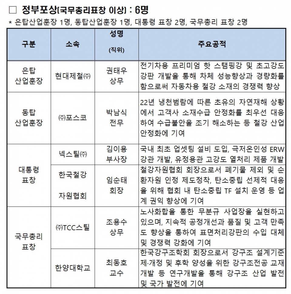은탑산업훈장 현대제철 권태우 상무, 동탑산업훈장 포스코 박남식 전무