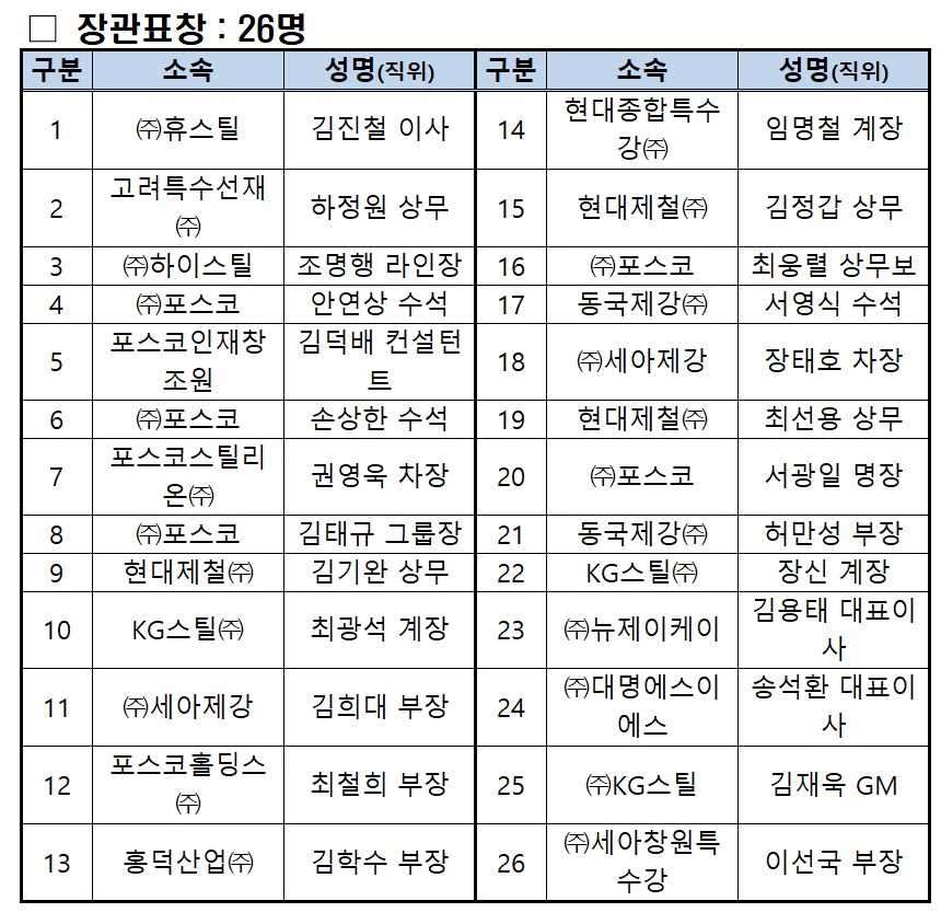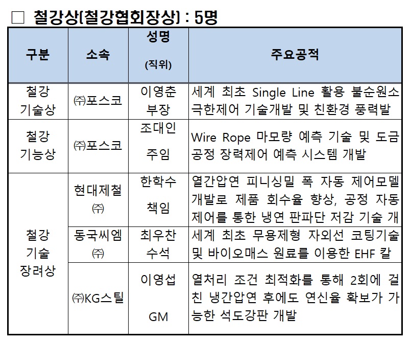 철강기술상에 포스코 이영춘 부장 등 5명... 유공자 32명 정부 포상 수여