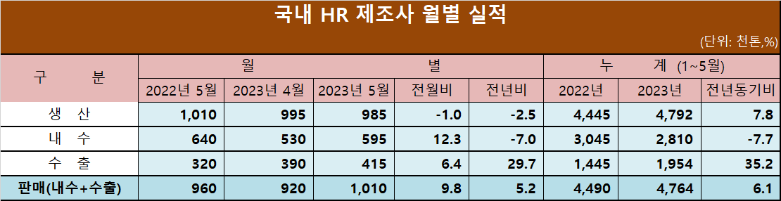 올해 5월 HR 제조업체들은 수출량은 41만5천톤으로 집계됐다. 이는 전월 대비 6.4%, 전년 대비로는 무려 29.7% 증가한 수치다. 올해 1~5월 누계 수출 실적은 165만5천톤으로 지난해 동기보다 35.2% 증가했다.
