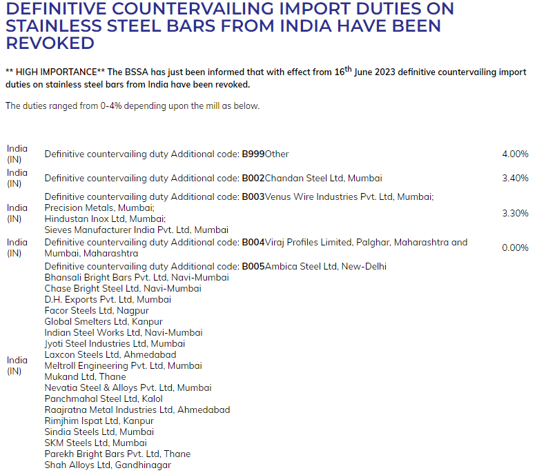 이와 관련해 영국스테인리스협회(British Stainless Steel Association)는 16일에 당국으로부터 상계관세가 취소됐다는 통보를 받았다고 전했다.