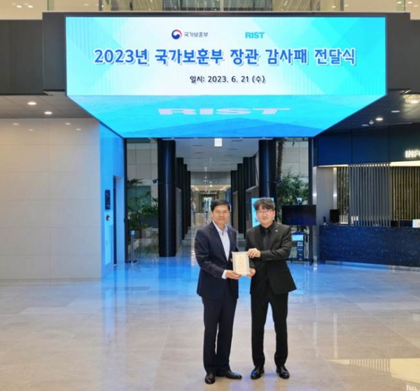 포항산업과학연구원(이하 RIST 원장 남수희)은 21일(수) ‘호국보훈의 달’을 맞아 국가유공자의 희생과 헌신을 기억하고, 예우와 존경의 문화 확산에 대한 공로를 인정 받아 국가보훈부로부터 감사패를 수상했다고 밝혔다.