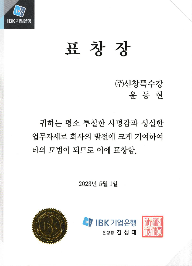한편 IBK기업은행이 매해 근로자의날(5월1일)을 기념해 개최하고 있는 ‘중소기업 모범사원’시상식에서 신창특수강 윤동형 부장이 표창장을 받았다. 이는 기업은행과 기은최고경영자클럽이 선발 및 표창하는 행사로, 표창 및 부상과 함께 여러 특전도 주어진다.