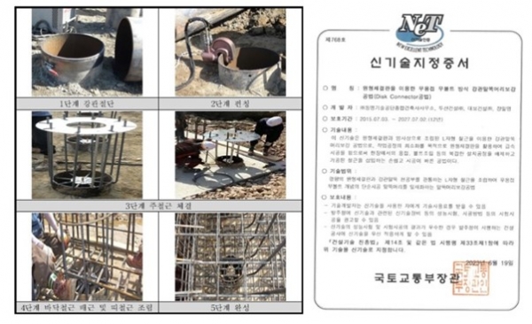 이 신기술은 원형체결판과 방사상으로 조립된 L자형 철근을 이용한 강관말뚝머리보강 공법으로 작업공정의 최소화를 목적으로 한다. 원형체결판을 활용하여 급속시공을 수행함으로써 현장에서의 용접, 볼트조립 등의 복잡한 설치공정을 배제하고, 가공된 철근을 삽입하는 빠른 시공이 장점인 기술이다.