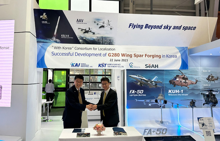 지난 22일, KAI는 프랑스 파리에어쇼(Paris Air Show)에서 G280 소재부품 국산화 성공 기념행사를 개최했다. KAI는 ‘With Korea’ 컨소시엄과 협력으로 국산화 개발에 성공한 G280 Wing Spar 단조품 2종 등을 전시했다.