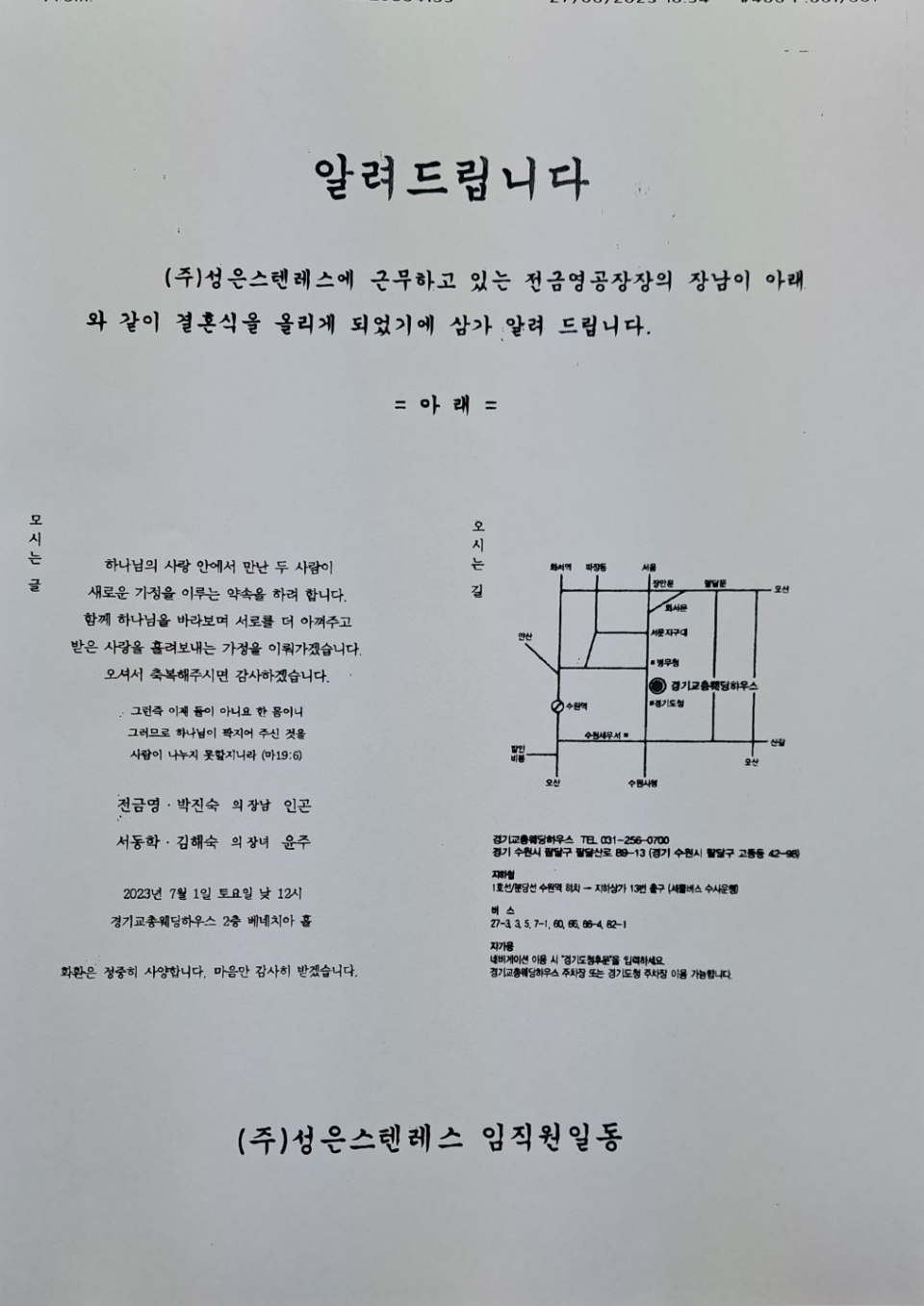 성은스텐레스 전금영 공장장의 장남 전인곤 씨가 오는 7월 1일 경기교총웨딩하우스에서 화촉을 밝힙니다. 업계분들의 축하를 당부드립니다. 일시 : 7월 1일 낮 12시 장소 : 경기교총웨딩하우스 2층 베네치아홀 키워드 #성은스텐레스 #전금영 #공장장 #특수강 #스테인리스 윤철주 기자 cjyoon@snmnews.com 다른 기사 보기 관련기사 (인사) 성은스텐레스, 2023년 임직원 승진 인사 발령 성은스텐레스, "끊임없는 원스톱 고객 만족 한길" 성은스텐레스, 대구 지사·공장 신축 이전 성은스텐레스, 철저한 품질관리가 자산 (결혼) 성은스텐레스 김창길 사장 장남 결혼식 성은스텐레스 스테인리스 채널· 앵글 판매로 바빠요 (결혼) 성은스텐레스 김창길 대표 차남 혼인 저작권자 © 철강금속신문 무단전재 및 재배포 금지