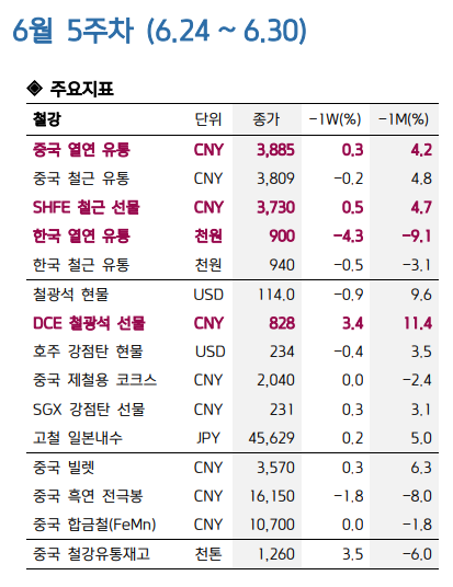 해당 리포트에 따르면 철광석 현물 가격이 지난 30일 종가 기준 114달러(CFR)를 기록했다. 이는 전주 대비 0.9% 하락한 수치다. 이종형 키움증권 연구원은 다롄 상품 거래소(DCE) 철광석 선물의 강보합세가 현물 가격의 낙폭을 제한했다고 설명했다.