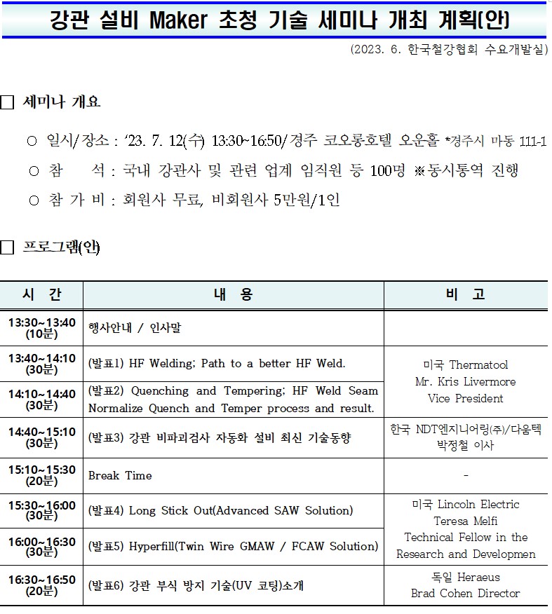 한국철강협회 강관협의회는 7월 12일 오후 1시 30분 경북 경주시 코오롱호텔에서 국내 강관업계 임직원을 대상으로 최신 강관 설비 및 기술동향 제공을 통해 국내 강관업계 경쟁력 강화를 위해 강관설비 메이커 초청 기술세미나를 개최한다.