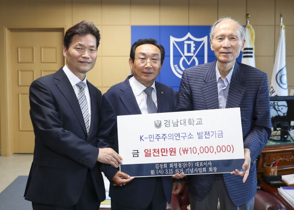 ▲ 화영철강㈜ 김장희 대표이사가 지난 5일 경남대 총장실에서 K-민주주의연구소 발전을 위한 기금 1000만원을 전달했다. 사진 왼쪽부터 정성기 K-민주주의연구소장, 화영철강 김장희 대표이사, 경남대 박재규 총장. /경남대