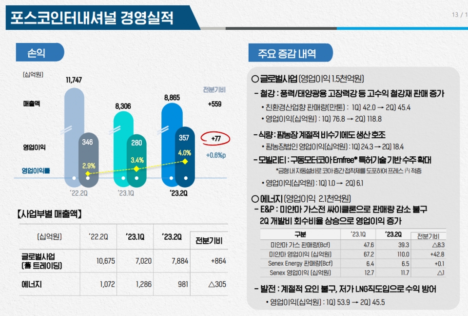 에너지 부문 사업 부진(-3,050억원)에도 친환경 고부가 철강재 판매 증가 등 글로벌 사업(+8,640억원)이 호조를 보인 영향이다.