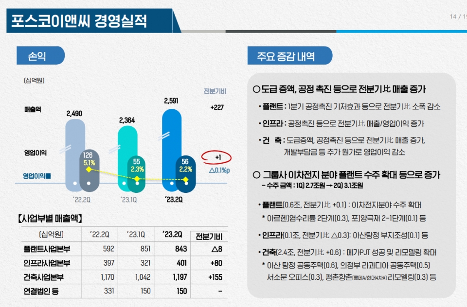 포스코홀딩스는 24일 '2023년 2분기 실적발표 기업설명회'에서 자회사 포스코이앤씨의 2분기 매출액이 2조5,910억원으로 전분기(2조3,640억원) 대비 2,270억원 증가했다고 밝혔다.
