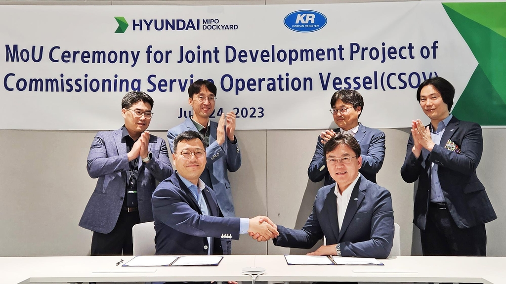 현대미포조선은 24일 HD현대 글로벌R&D센터에서 한국선급(KR)과 ‘해상풍력유지보수 지원선(CSOV)’ 기본설계 공동개발(JDP)을 위한 업무협약을 맺었다.