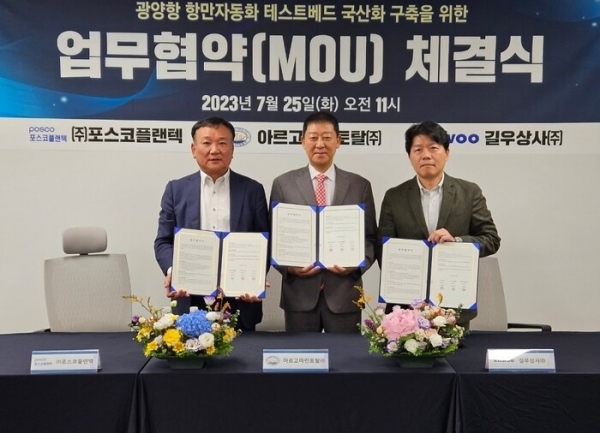 포스코플랜텍은 지난 25일 아르고마린토탈 및 길우상사와 여수광양항만공사에서 추진하는 광양항 3-2단계 자동화 테스트베드 구축사업 관련 협력을 위해 공동 업무협약을 체결했다.