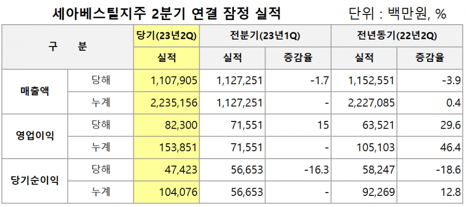 세아베스틸지주는 세아창원특수강이 지난해 2분기에 그룹 편입 이후 최대 매출액 및 영업이익을 거둔 바가 있다며 이에 따른 기저효과로 실적이 악화된 것처럼 보일 뿐이지 예년 2분기 실적과 비슷한 수준을 유지했다고 설명했다. 실제로 세아창원특수강의 2022년 영업이익은 498억원 수준으로 이전인 19년 2분기 132억원, 20년 2분기 200억원, 21년 2분기 350억원보다 급증한 바 있다.