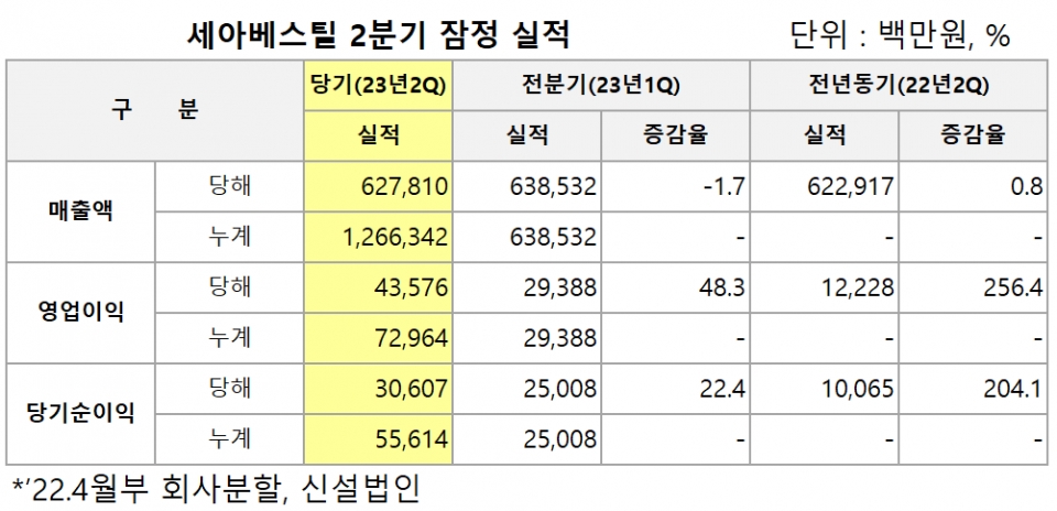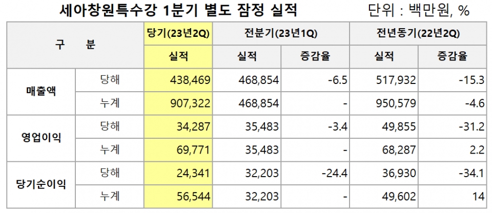 지난 2022년 세아그룹에 편입된 세아창원특수강은 2분기 경영실적으로 매출액 4,384억6,900만원(별도 기준), 영업이익 342억8,700만원, 당기순이익 243억4,100만원을 달성했다.
