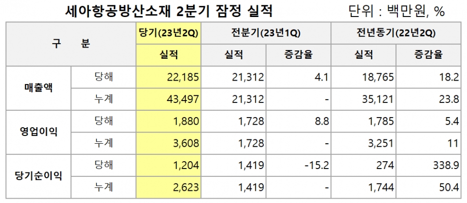 이런 가운데 국내 항공우주산업 및 방산업의 성장세로 세아항공방산소재는 2분기 매출액으로 221억8,500만원, 영업이익 18억8,000만원, 당기순이익 12억400만원을 기록했다. 매출액은 전년 동기 대비 18.2%, 직전 분기 대비 4.1% 증가했다. 영업이익은 전년 동기 대비 5.4% 직전 분기 대비 8.8% 증가했다.