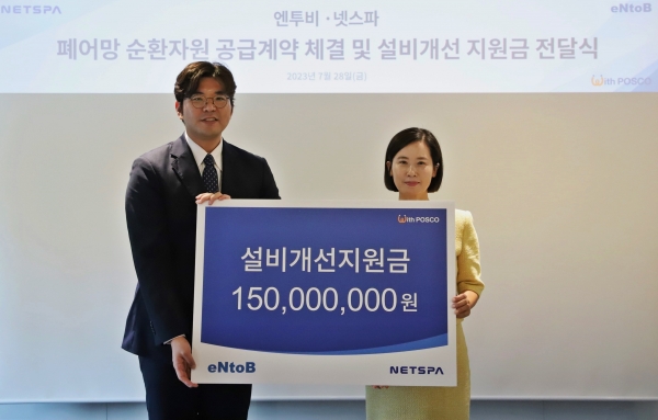 엔투비(대표 이유경)가 폐어망 리사이클링 소셜벤처 기업인 넷스파와 '순환자원 공급계약을 체결하고 지원금을 전달했다. 지난 7월 28일 진행된 공급 계약 체결 행사에는 이유경 엔투비 대표, 정택수 넷스파 대표 등이 참석했다.