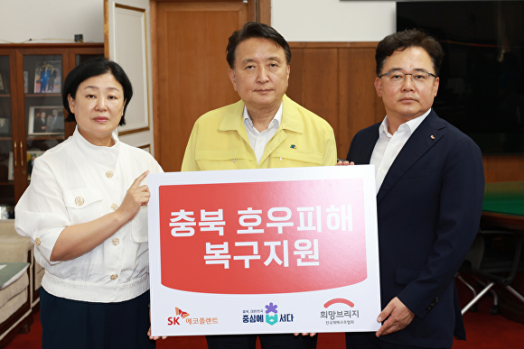3일 도에 따르면 박경일 SK에코플랜트 대표가 충북도청을 찾아 김영환 지사, 김정희 희망브리지 전국재해구호협회 사무총장 등이 참석한 가운데 성금 전달식을 가졌다. 성금은 이재민을 위한 구호품 지원, 피해복구 등을 위해 사용될 예정이다.