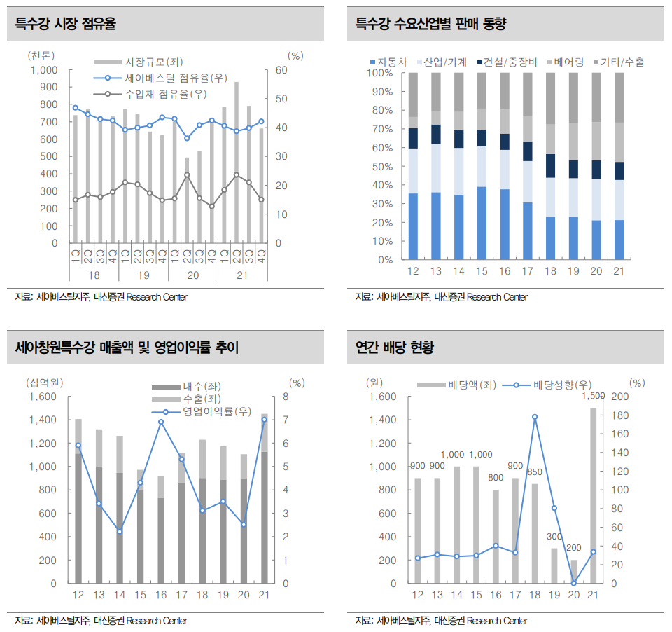 특히 주요 자회사인 세아베스틸과 세아창원특수강의 판매량 각각 직전 분기 대비 3.9%, 9.1%감소했다. 그럼에도 자동차향 특수강 등 고부가가치 제품 판매 전략(세일즈 믹스)과 생산시스템 개선, 원가 절감 등의 노력으로 세아베스틸은 영업이익 증가를, 세아창원특수강은 스테인리스 시황 부진에도 급격한 실적 악화를 방어했다.