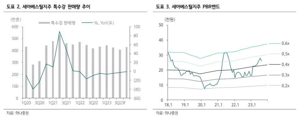 하나증권 박성봉 연구원은 “세아베스틸은 계절적 비수기와 연휴 효과로 3분기 특수강 판매량이 2분기 대비 4.7% 감소한 40만6천톤을 달성할 것으로 전망되고 공격적인 가격 인상 정책이 쉽지 않아 보이지만 고철 가격이 강세로 전환될 가능성이 제한될 것으로 판단된다”라며 “세아창원특수강도 비수기 영향으로 판매량 감소가 예상되지만 주요 원재료인 니켈 가격이 바닥을 확인한 것으로 보이기 때문에 마진 축소 가능성은 제한적”이라고 평가했다.