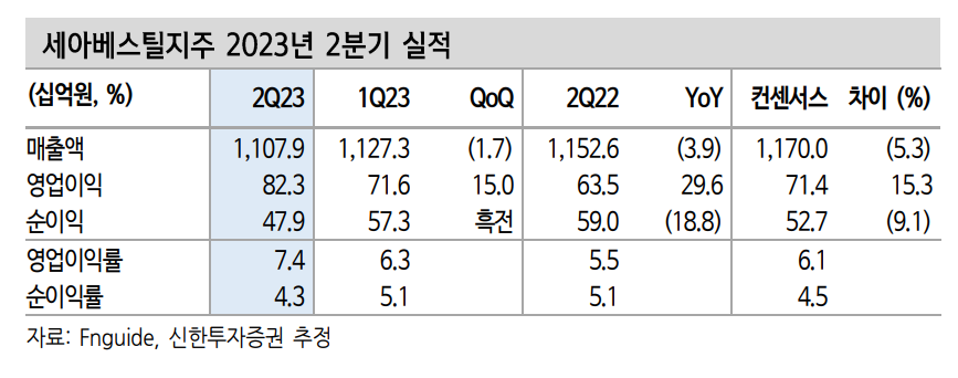 세아베스틸은 최근 실적 발표에서 2분기 매출액으로 직전 분기 대비 1.7% 증가한 약 1조1천억원, 영업이익으로 직전 분기 대비 15% 증가한 823억원을 달성한 바 있다. 이 중 영업이익은 시장 예상치(컨센서스)인 710억원대를 상회했다.