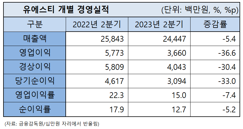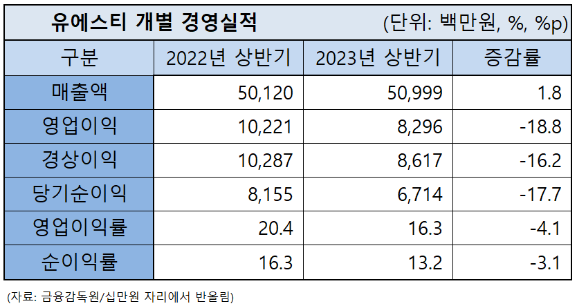 다만 회사의 수익성은 지난해 상반기 글로벌 철강 가격 강세 시기와 다르게 판관비 증가와 법인세 비용 증가 등으로 일부 악화됐다. 유에스티의 상반기 영업이익은 82억9,626만원으로 전년 동기 대비 약 19억3천만원, 18.8% 감소했다. 반기순이익도 67억1,422만원으로 전년 동기 대비 약 14억4천만원, 17.7% 감소했다. 2분기의 경우 영업이익은 36억6,029만원을, 당기순이익은 30억9,441만원을 기록했다.