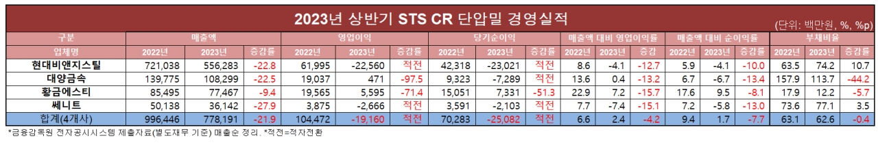 STS CR 단압밀 업계가 사실상 상반기에 만원어치를 팔아 250원을 손해 보는 장사를 했다. 다만 황금에스티와 대양금속은 영업이익률이 7.2%, 0.4%로 영업이익이 마이너스로 전환되지 않았다.