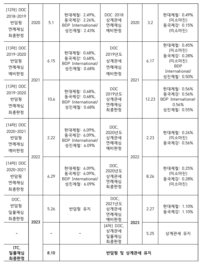 ITC는 후판에 대한 반덤핑 및 상계관세 부과를 철회할 시, 미국 산업에 실질적인 피해가 지속 또는 재발될 것이라고 언급하며 기존과 같은 반덤핑(6.09%) 및 상계관세(1.10%)를 유지한다고 밝혔다. 이는 한국을 포함한 인도, 인도네시아 후판에도 적용된다.