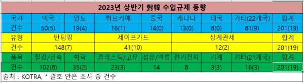 KOTRA가 발행한 ‘2023년 상반기 對韓 수입규제 동향과 전망’ 보고서에 따르면 2023년 6월 30일 기준 전 세계 28개국에서 총 201건의 대한 수입규제 조치가 시행 중이다.