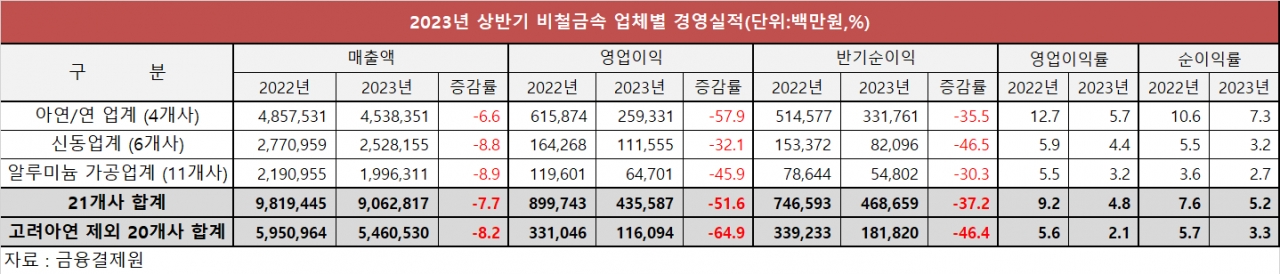 비철금속 제조업체 21개사(금융결제원 반기보고서 제출 기준)의 상반기 경영실적 조사자료에 따르면, 전체 매출은 전년 동기 대비 7.7% 감소했고, 영업이익은 업종을 가리지 않고 부진한 양상을 보이면서 지난해 상반기에 비해 51.6%나 줄었다. 반기순이익도 37.2% 급감한 것으로 집계됐다.