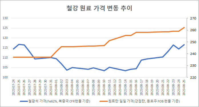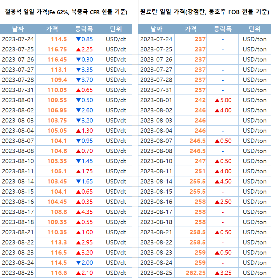 [표]일일 철강 원료 가격 동향(8월 25일)