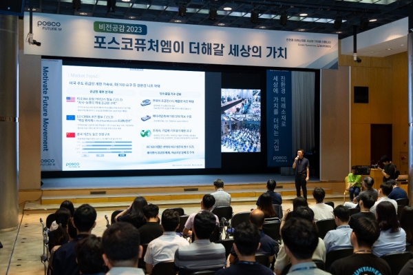 포스코퓨처엠은 28일 대치동 포스코센터에서 김준형 사장을 비롯한 임직원들이 참석한 가운데 <비전 공감 2023 : 포스코퓨처엠이 더해갈 세상의 가치> 행사를 열고, 새로운 비전 ‘친환경 미래소재로 세상에 가치를 더하는 기업(Motivate Future Movement)'을 공개했다. 새로운 비전은 미래 친환경 사회 실현에 기여하는 소재를 개발해 세상에 필요한 가치를 만들고, 이를 통해 더 나은 세상을 만들어 나가겠다는 의미를 담고 있다.
