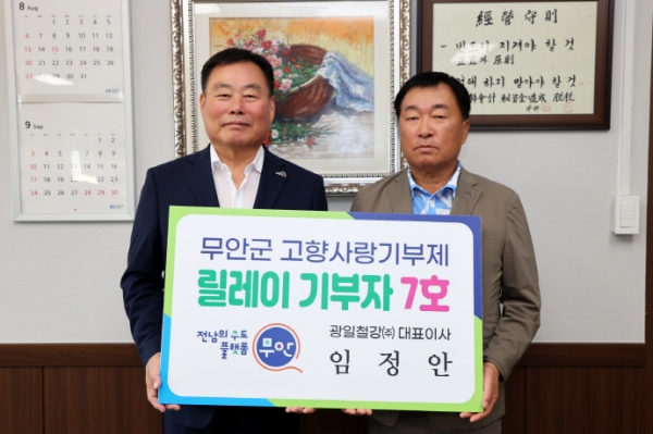 고향사랑기부 릴레이의 일곱 번째 주자로 나선 광일철강 임정안 대표이사는 무안군 일로 출신 향우 기업인으로 CBS 최옥수 국장의 소개로 참여하여 무안군에 500만 원을 흔쾌히 기탁하고 무안의 더 큰 발전과 군민의 더 큰 행복을 응원했다.