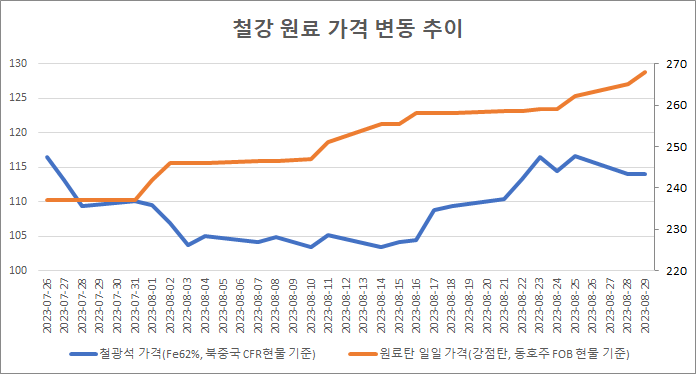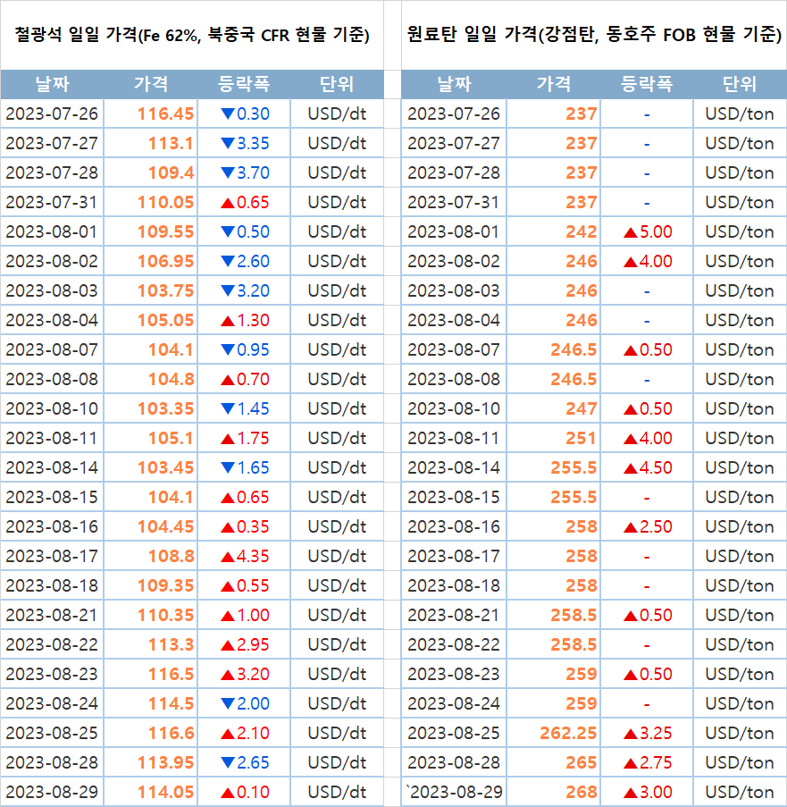 [표]일일 철강 원료 가격 동향(8월 29일)