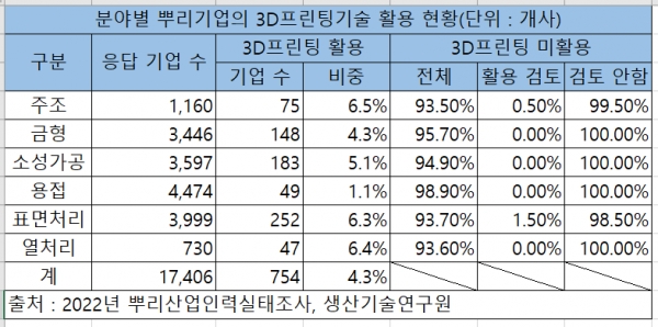 산업부가 산업별 인력수급정책 지원을 위해 지정한 3D프린팅산업과 뿌리산업 인적자원개발협의체의 인력실태조사에 따르면 기반공정 6대 뿌리기업 1만7,000여 개사 중 3D프린팅 활용기업은 754개사이며, 이 중 56.3%가 3D프린팅 장비 및 담당인력을 보유하고 있는 것으로 확인됐다.