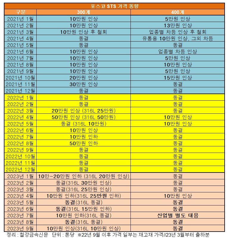 이에 포스코는 9월 STS316L 강종 할증료도 톤당 10만원 인상하기로 결정했다. STS316L 가격 인상은 올해 3월 이후 반년(6개월)만이다. 다만 포스코는 400계 가격은 동결을 유지하겠따고 밝혔다.