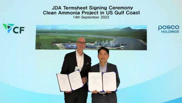 14일 포스코홀딩스는 <H2 MEET 2023>가 열리고 있는 일산 킨텍스에서 씨에프인더스트리즈와 미국 루이지애나州 블루암모니아 사업 추진을 위한 JDA(Joint Development Agreement, 공동개발협약) 주요거래조건서(term sheet)에 서명했다.