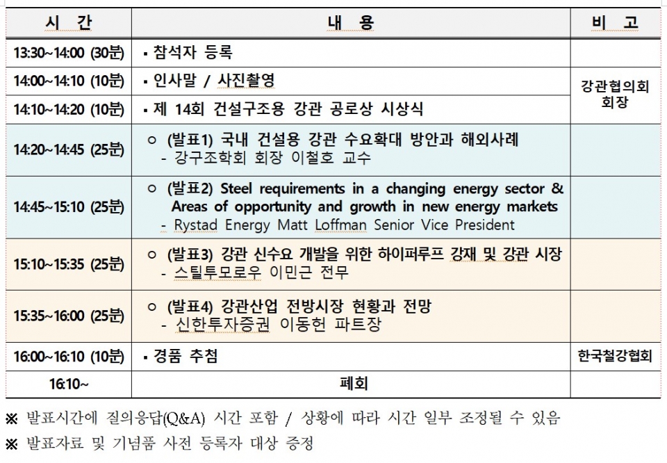 또한 스틸투모로우 이민근 전무가 강관 신수요 개발을 위한 하이퍼루프 강재 및 강관 시장, 신한투자증권 이동헌 파트장이 강관산업 전방시장 현황과 전망에 대해 발표한다. 이번 세미나에는 100명에 한하여 사전 신청자에 한하여 기념품을 지급하고, 세미나 종료 후 추첨을 통해 주방용품을 나누어 줄 예정이다.