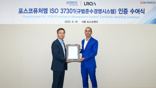 ‘ISO37301’은 기업이 글로벌 비즈니스 환경에 부합하는 준법경영 시스템을 갖추고 있음을 확인하는 인증이다. 국제표준화기구(ISO)가 2021년 제정했고, 준법경영을 위한 규정과 지침을 종합적으로 평가해 인증을 부여한다. 포스코퓨처엠은 준법경영 시스템 구축 및 운영을 위한 전사적 노력을 기울인 결과 우수한 평가를 받으며 인증 심사를 통과했다.