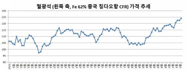 우선 철광석 가격(중국 칭다오항 수입가격 기준)은 지난 5월 23일 톤당 97.35.52달러로 단기 저점을 기록했다. 이후 상승세를 보이면서 9월 11일 120달러를 돌파했다. 15일 가격은 125.60달러를 기록했다. 상승률은 29%%에 달하고 있다.
