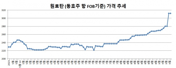 원료탄 가격 상승률은 더욱 높다. 원료탄 역시 5월말 저점을 기록한 이후 지속적인 상승세를 이어가면서 최근 300달러를 돌파했다. 3개월 여동안 41%가 넘는 상승률을 나타내고 있다. 지난 15일 동호주항 기준 프리미엄 원료탄 가격은 톤당 314.75달러를 기록하며 초강세다.