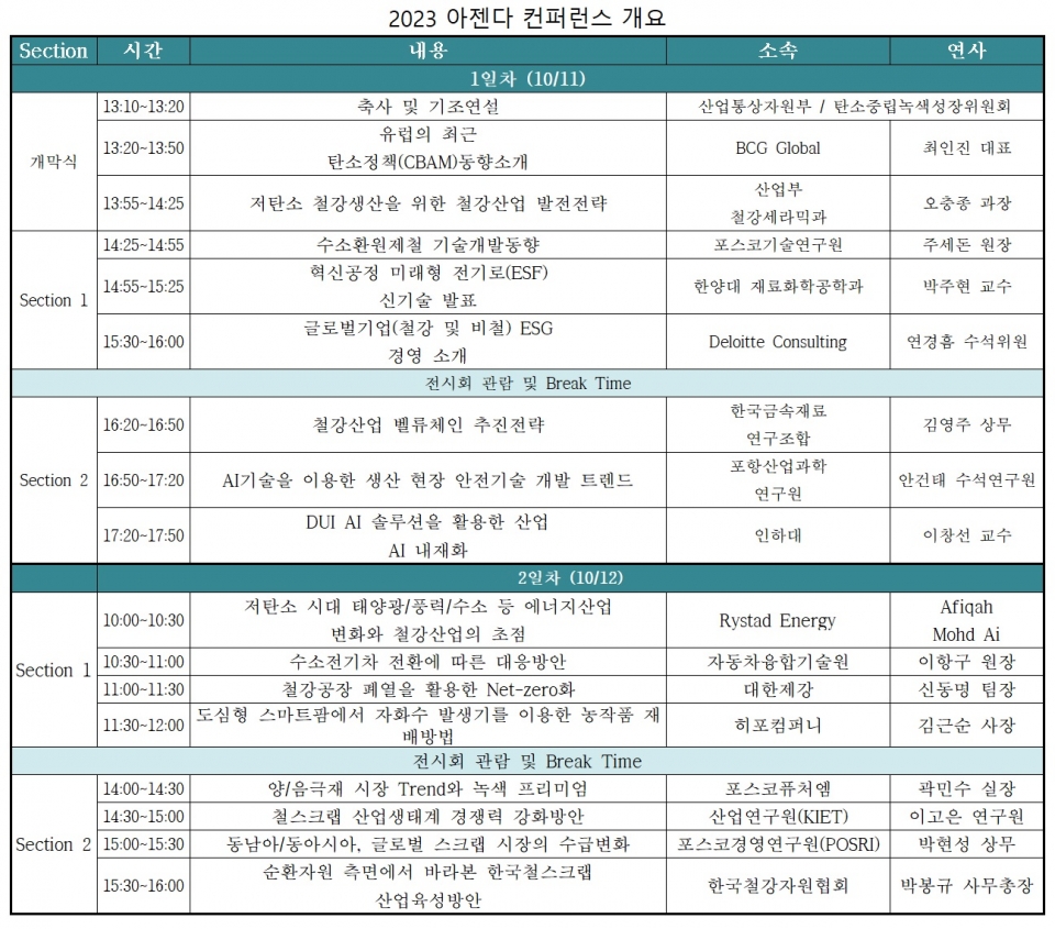우선, 1일 차에는 유럽의 최근 탄소정책(CBAM)동향소개(BCG Global 최인진 대표), 저탄소 철강생산을 위한 철강산업 발전전략(산업부 철강세라믹과 오충종 과장), 수소환원제철 기술개발 동향(포스코기술연구원 주세돈 원장), 혁신공정 미래형 전기로(ESF) 신기술 발표(한양대 재료화학공학과 박주현 교수), 글로벌 철강 및 비철 기업 ESG 경영 소개(Deloitte Consulting 연경흠 수석위원), 철강산업 벨류체인 추진전략(한국금속재료 연구조합 김영주 상무), AI 기술을 이용한 생산 현장 안전기술 개발 트렌드(포항산업과학연구원 안건태 수석연구원), DUI AI 솔루션을 활용한 산업 AI 내재화(인하대 이창선 교수) 등의 강연이 마련됐다.